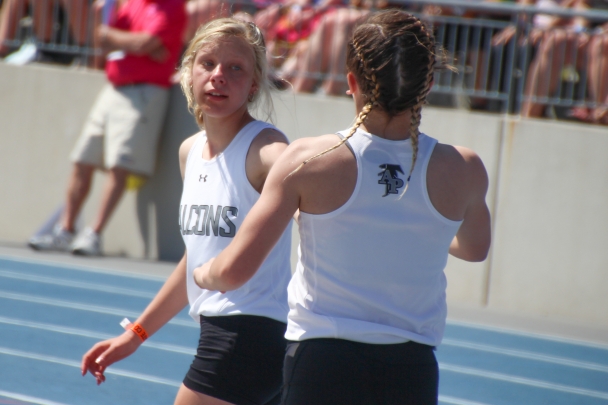 Aplington-Parkersburg's Maci Freund reaches back for the baton from Sommer Stotler during the 4x800 relay at the 2019 state track and field meet. Both Freund and Stotler are among those returning for the Falcons at the 2021 meet. (Jake Ryder photo)