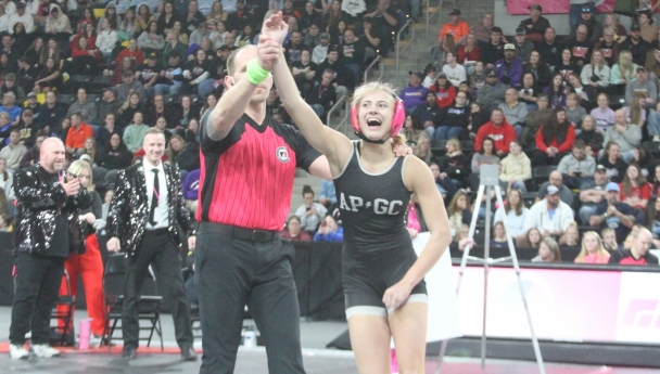 APGC senior Grace Storjohann became the first-ever APGC girls wrestling champion, pinning West Liberty's Aileen Aragon for the Class 1A title at 125 pounds.